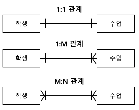 카디널리티는 한 엔터티(Entity)의 한 개체가 다른 엔터티의 몇 개체와 연결될 수 있는지를 나타내는 관계의 수.