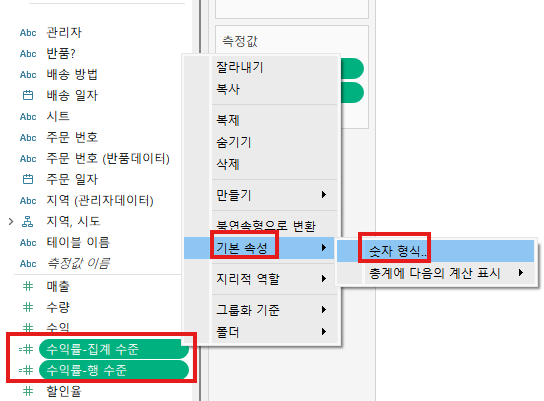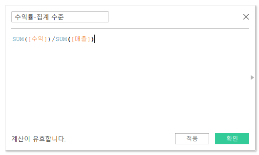 | 예시 | [수익] / [매출] | SUM([수익]) / SUM([매출]) |
