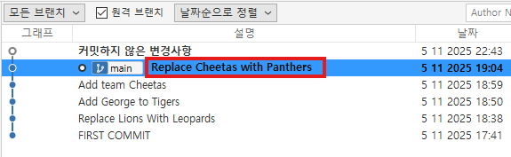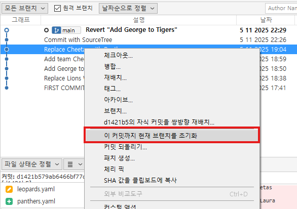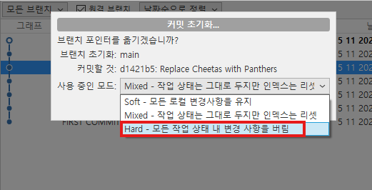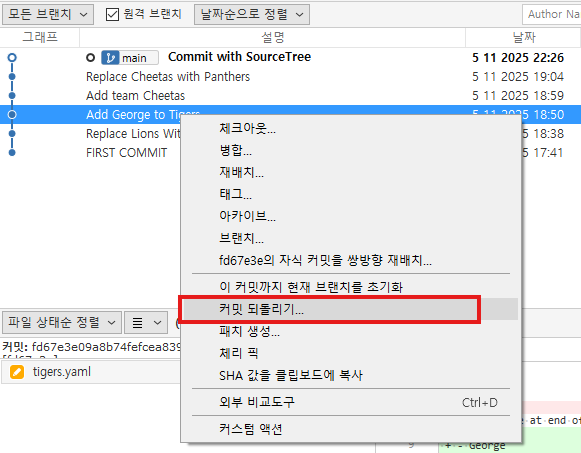 수정이 필요한 시점에서 오른쪽마우스를 클릭 -> 커밋 되돌리기