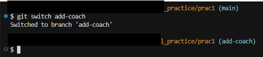 명령어를 실행해보니 맨 오른쪽에 표시되는 브랜치명이 "add-coach"로 변경된 것을 볼 수 있습니다