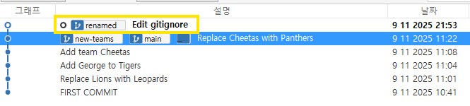 다른 브랜치는 다섯번째 커밋에 머물러있는데요 renamed는 새로운 커밋으로 뻗어난것을 확인할 수 있습니다