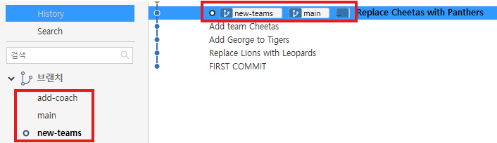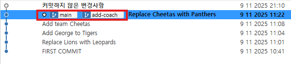 기존에 main 브랜치와 추가된 add-coach가 보입니다