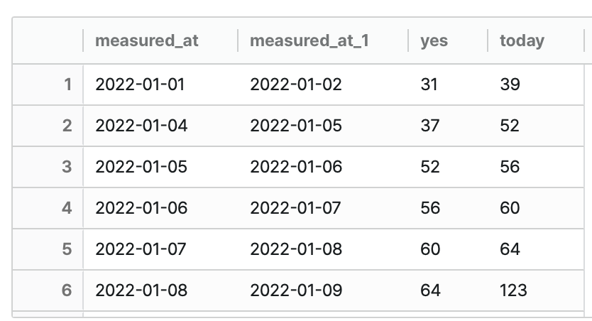 ON t.measured_at = yes.measured_at + INTERVAL 1 DAY
